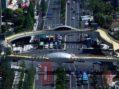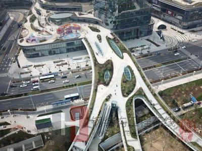 天橋的造型仿佛一棵大樹,有樹干、樹枝,從空中俯瞰,整個香樟林就相當于一個大的樹冠,而天橋周圍的建筑外立面將裝修做成樹葉狀。